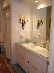 In the shower we added glass tile border and a few accent tiles for design. The walls are painted a light beige and